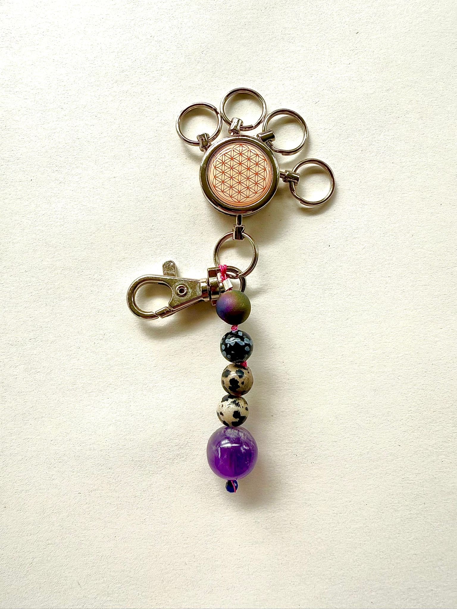 Praktischer Anhänger mit mehreren Anhängerösen und Blume des Lebens Detail aus verschiedenen Edelsteinen.