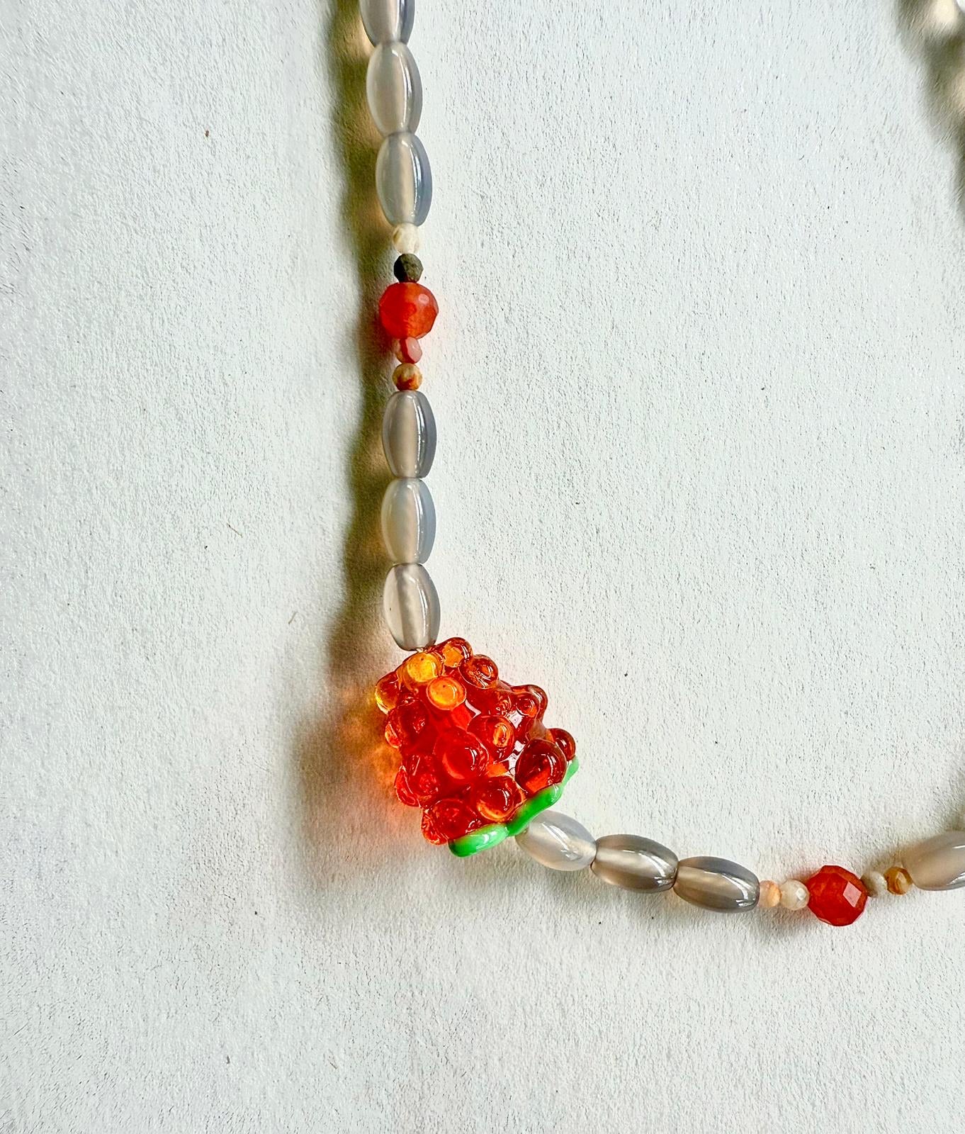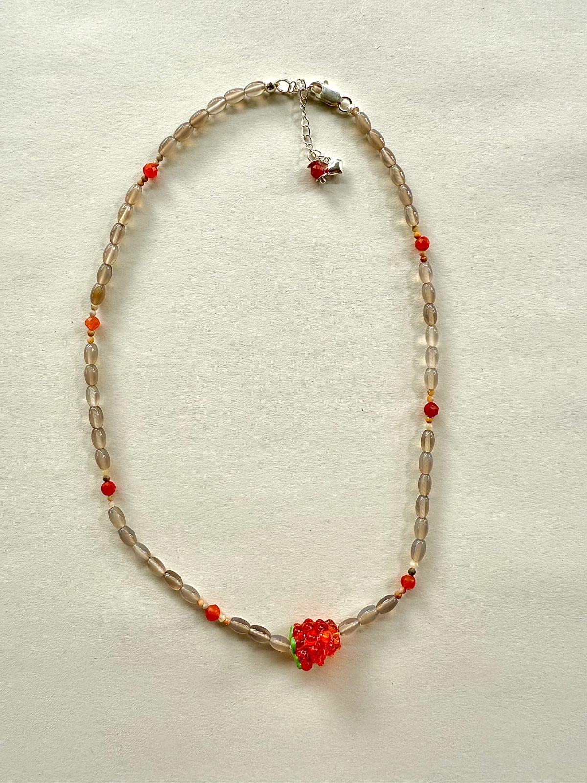 Feine graue Achatperlen kombiniert mit zartem orangen Carneol. Als Detail, eine verspielte Glasperle in orangener Himbeerform.