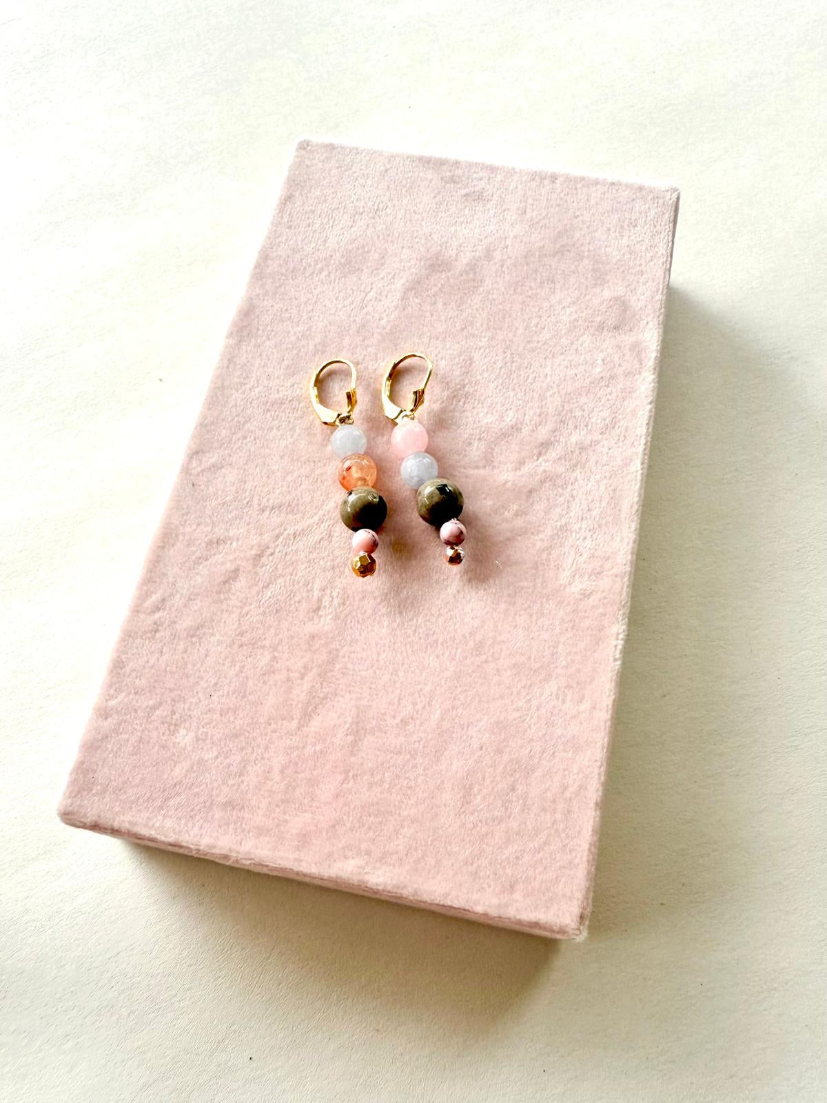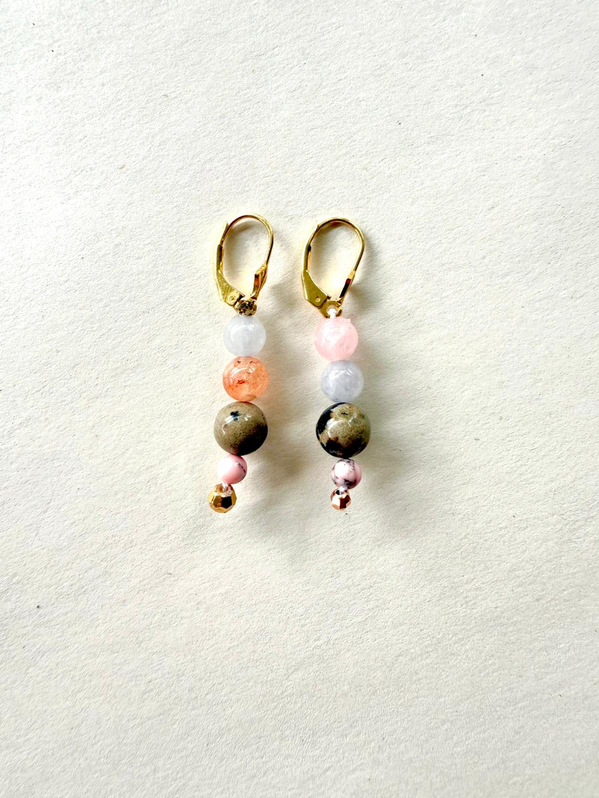 Verspielte Ohrringend aus Rosenquarz, Dalmatinerstein, Jaspis und Quarze.