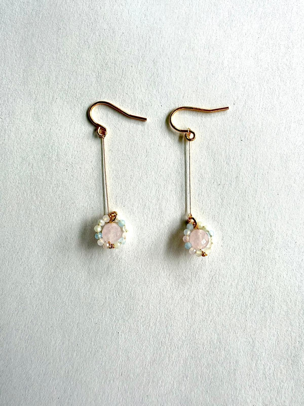 Zarte Ohrringe mit Rosenquarz und Fluorier als delikaten Hänger verarbeitet.