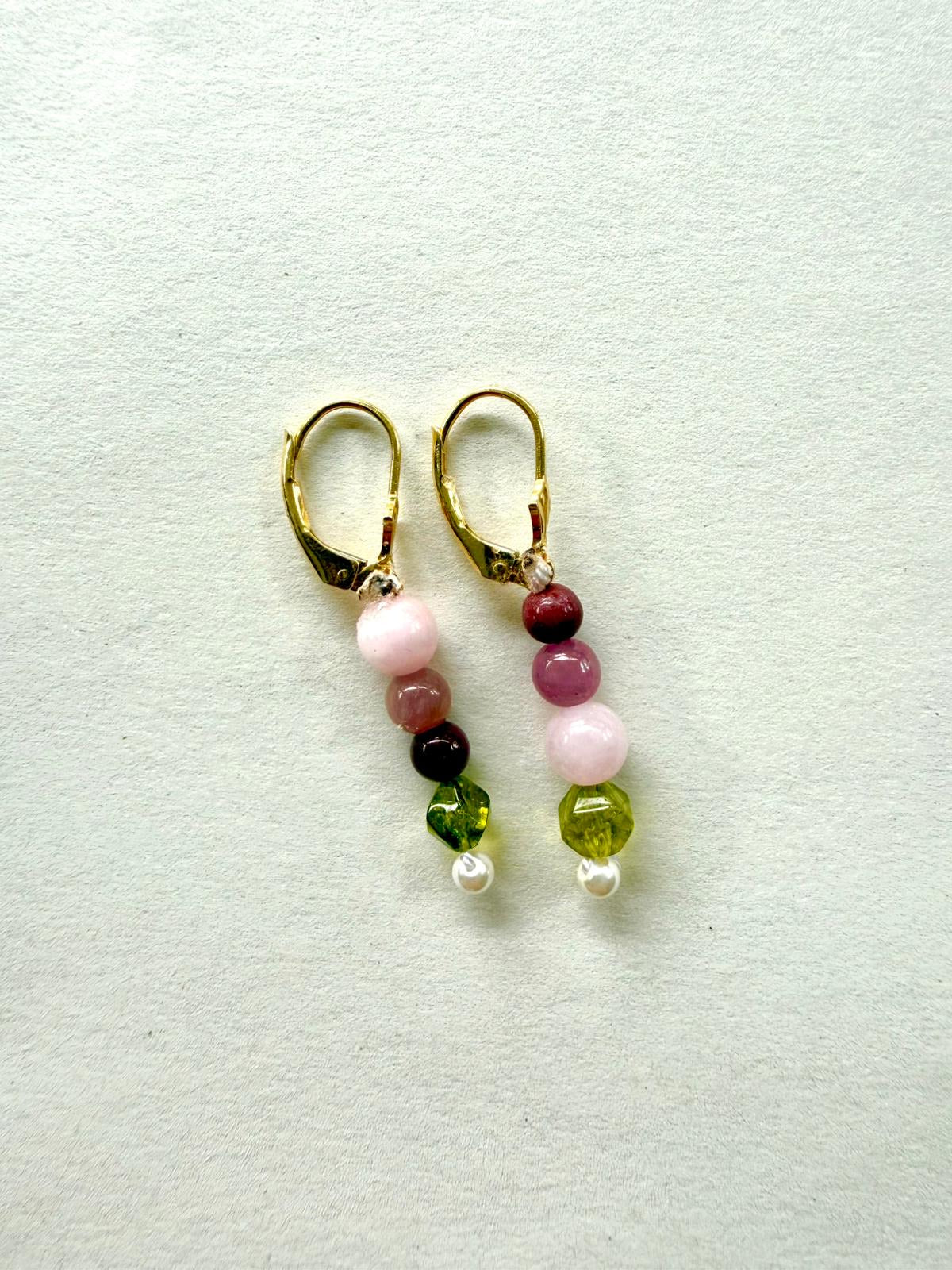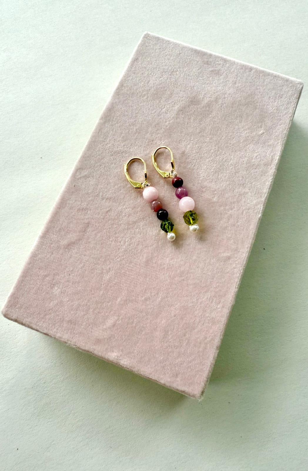 Verspielte Ohrringend aus Rosenquarz, Peridot, Mokant und Bergkristall. Liebevoll zum modernen Statement Piece verarbeitet.