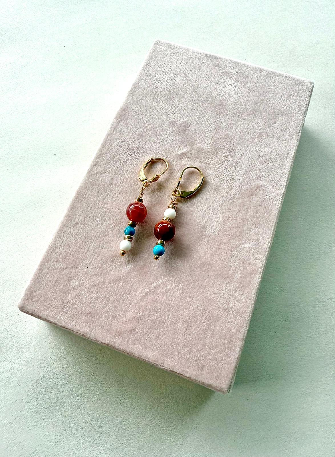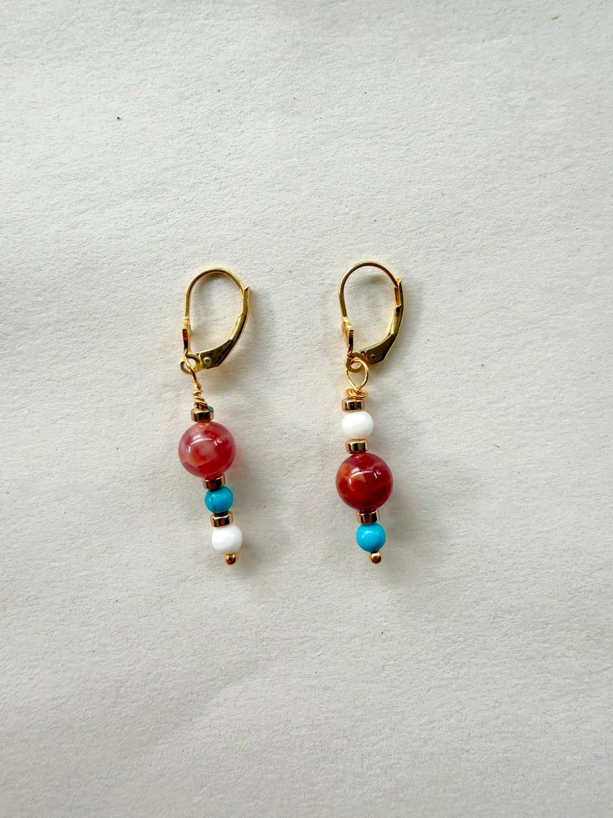 Verspielte Ohrringe aus Türkis, Perlmutt und Quarz.