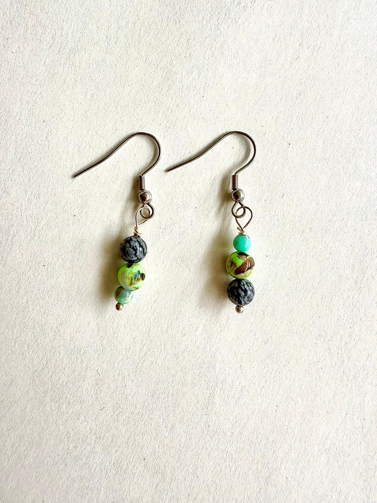 Verspielte Ohrringe aus Schneeflockenobsidian, Seesediment, Jaspis und Muschelperlen. Liebevoll zum feinen Statement Piece verarbeitet.