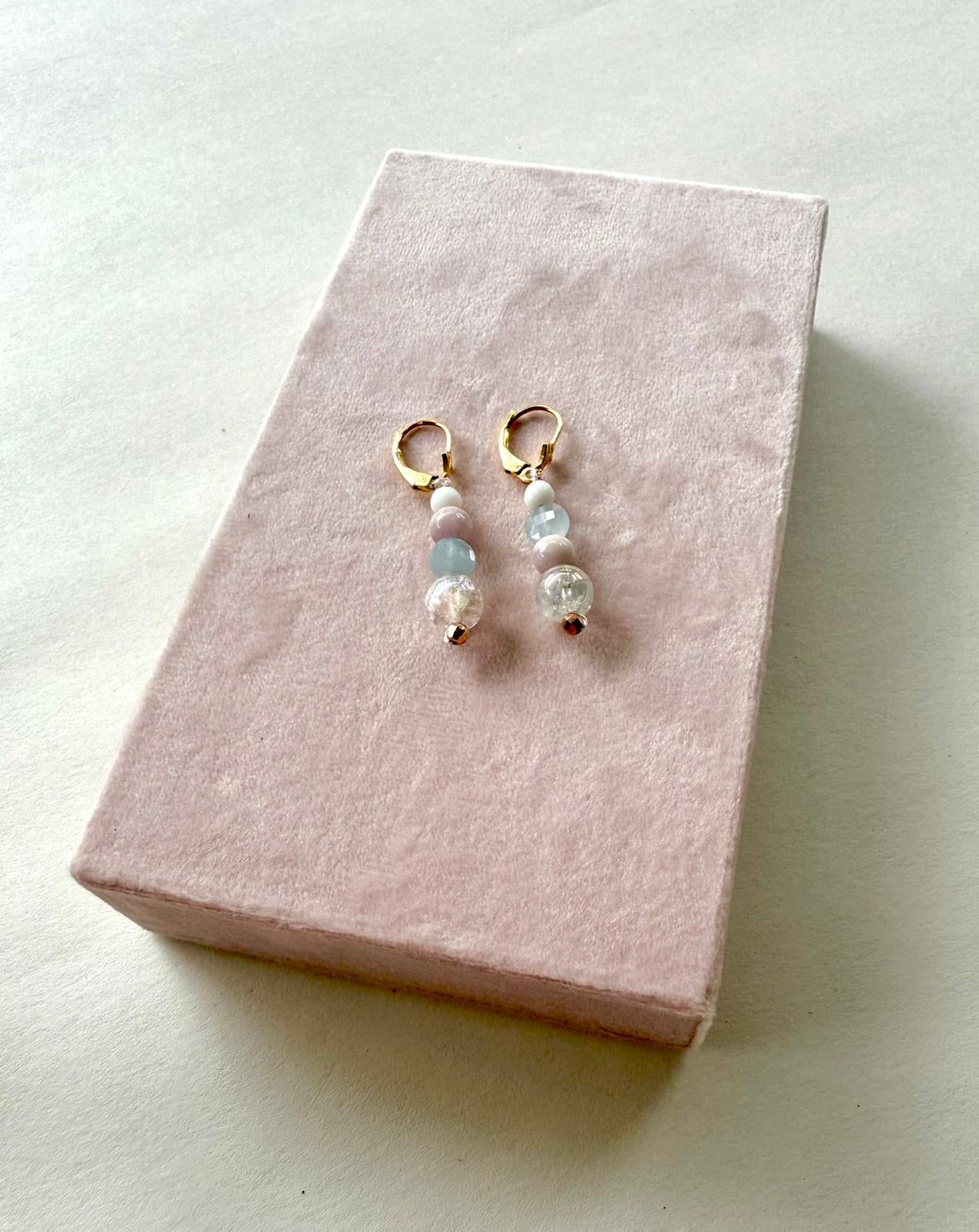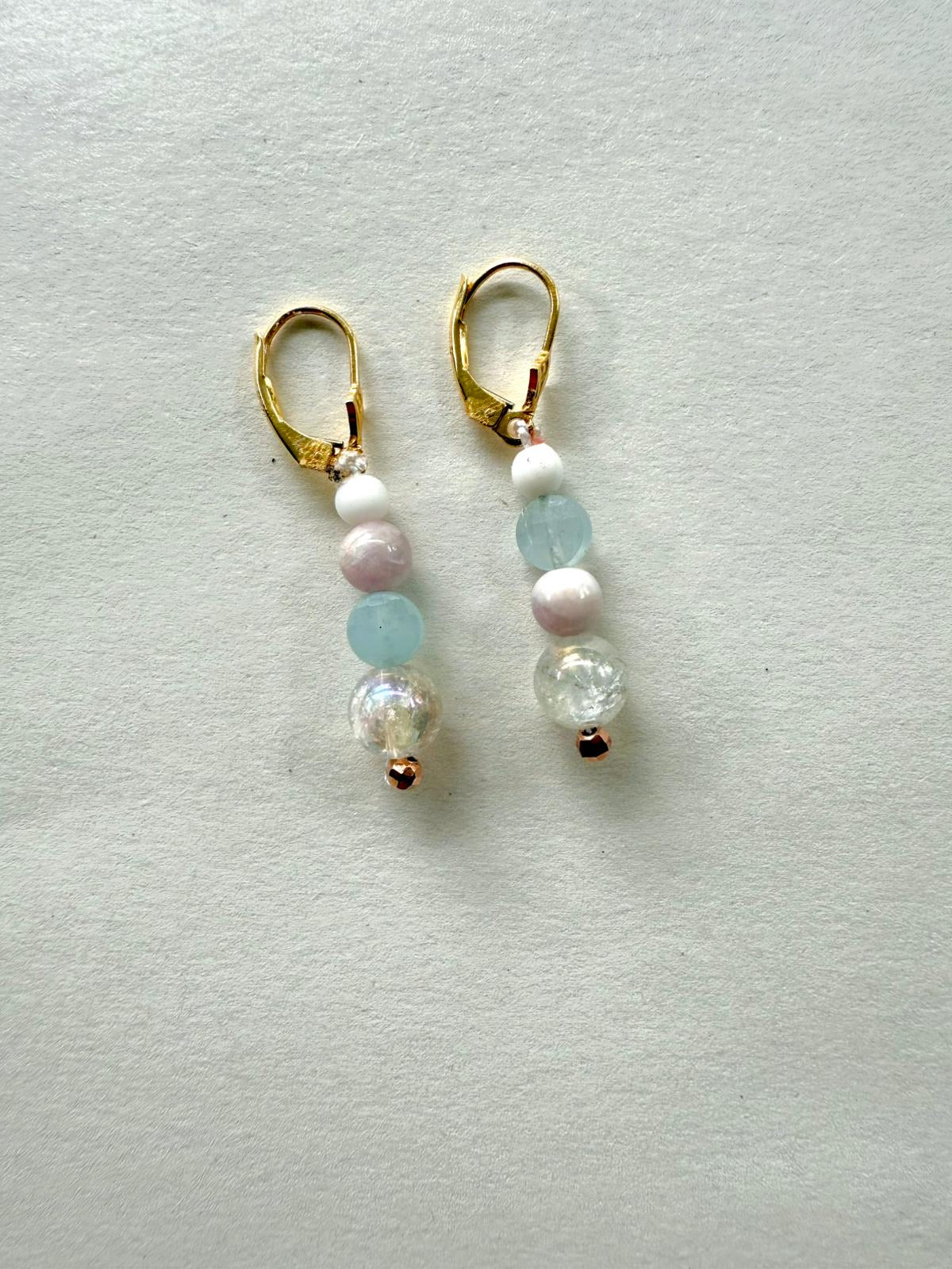 Verspielte Ohrringe aus Bergkristall, Perlen und Jade.