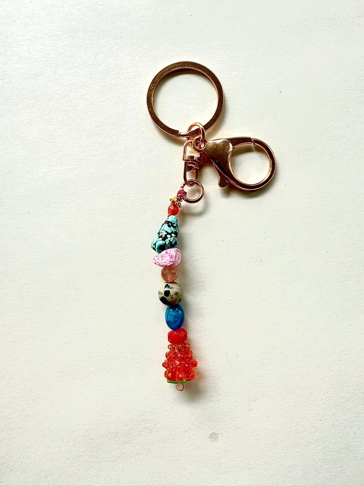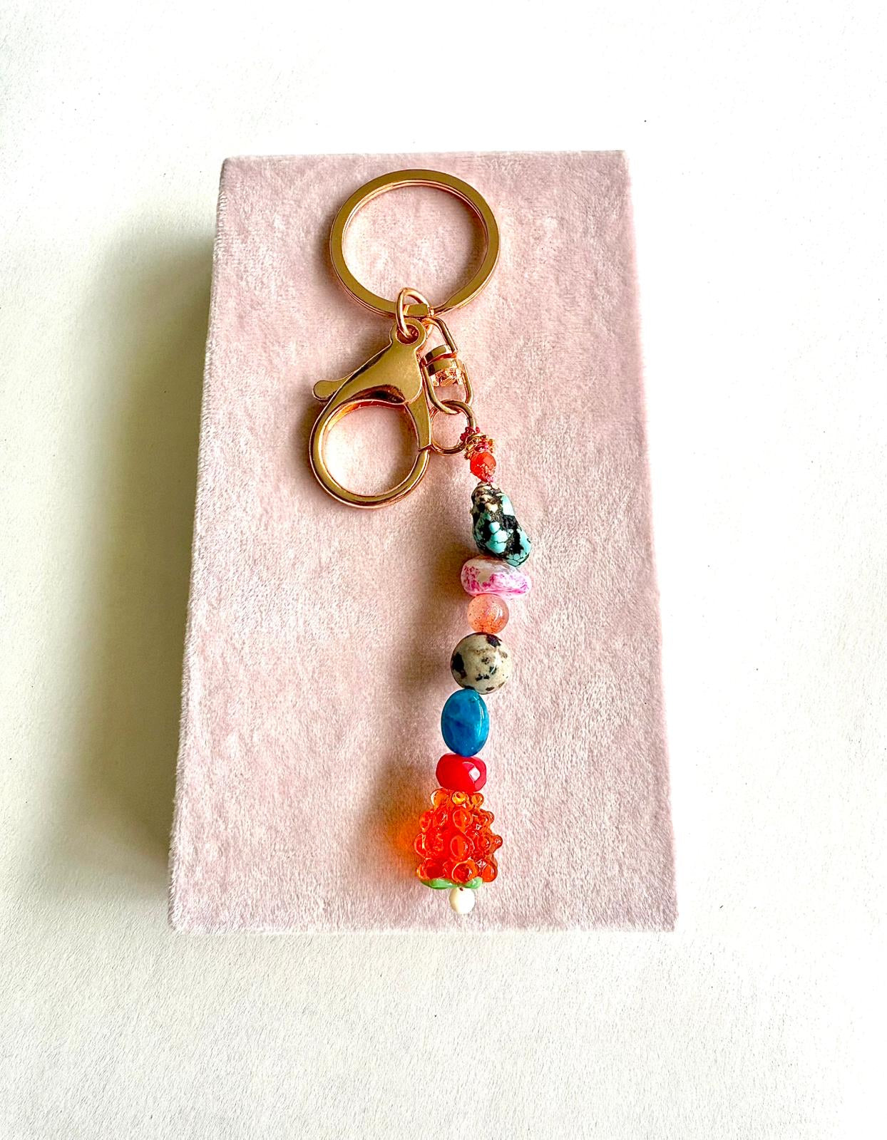 Anhänger aus verschiedenen Edelsteinen mit orangener Glashimbeere als süsses Detail.